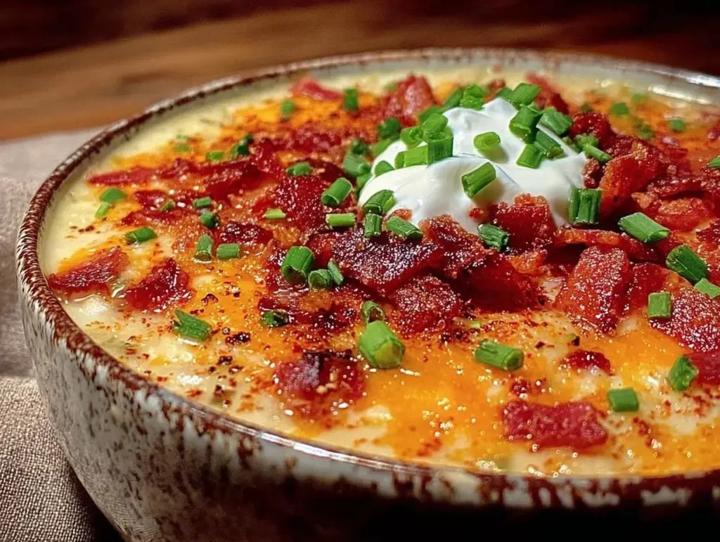 A comforting and creamy baked potato soup loaded with smoky bacon, sharp cheddar, and fresh chives. Ready in 30 minutes, perfect for cozy dinners and family gatherings.