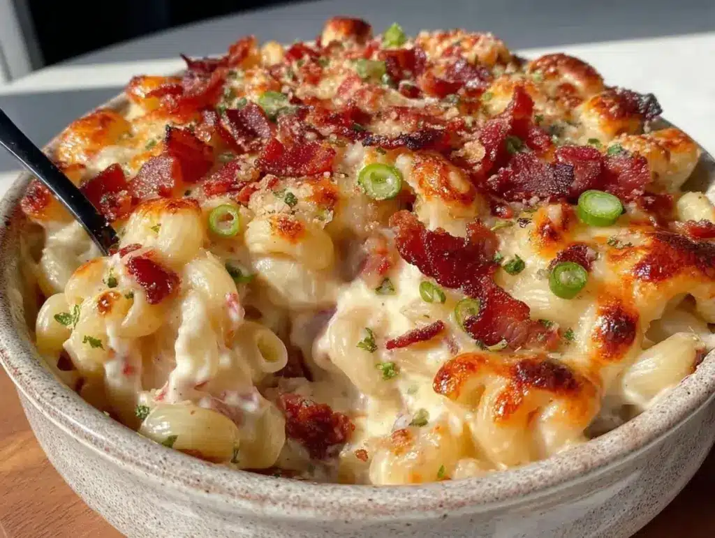 This loaded baked mac and cheese features crispy bacon, creamy ranch-infused cheese sauce, and a golden, bubbly topping. It’s a comforting, crowd-pleasing casserole perfect for weeknight dinners, potlucks, or family gatherings.